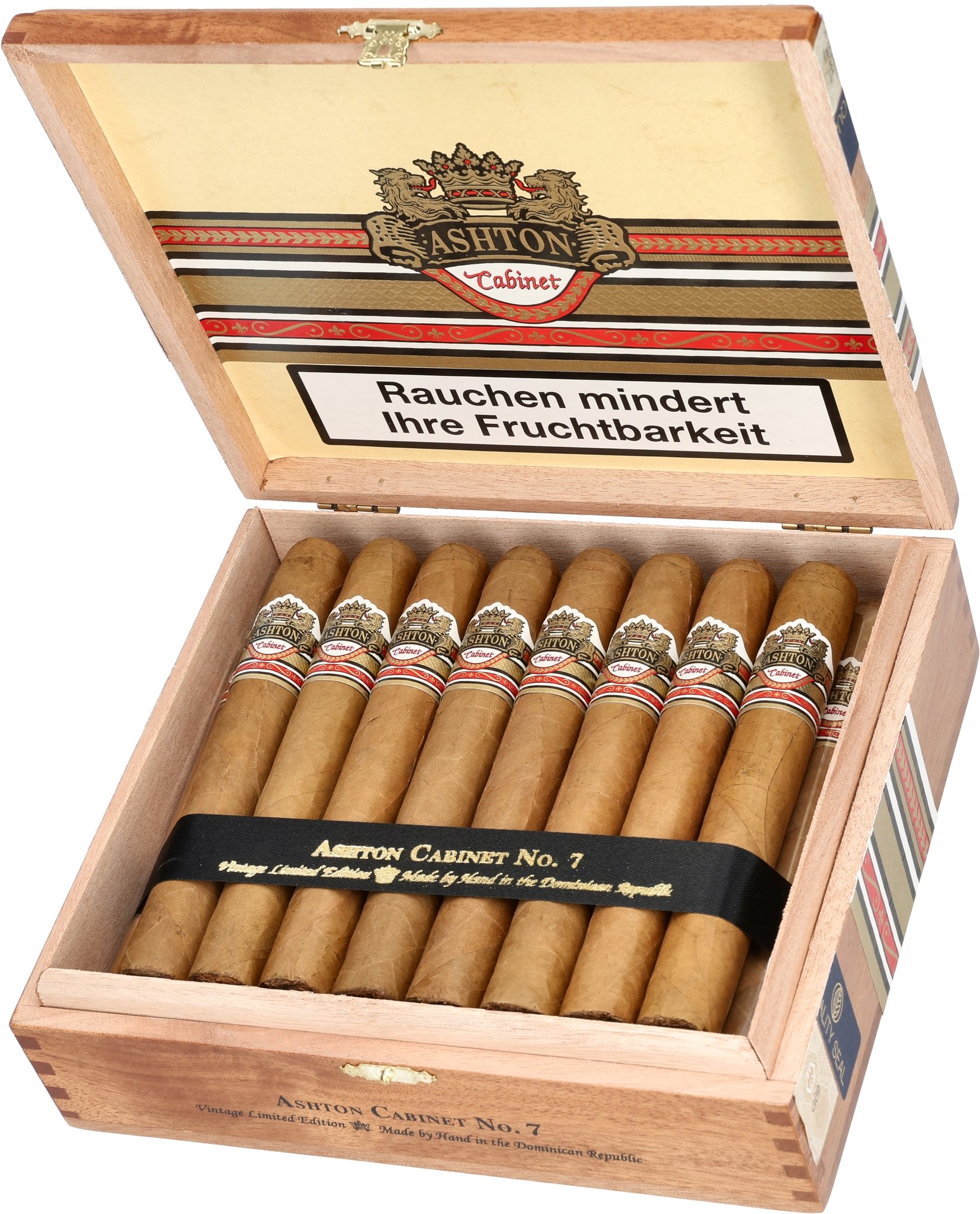 Dank der ausgeklügelten Herstellung verfügen die Zigarren der Linie Ashton Cabinet – Selection No. 7 Cabinet über ein harmonisches Aroma, welches zugleich würzig und mild ist und eine gewisse Süße aufweist. Dies ist nicht zuletzt dem Deckblatt der Sorte "Connecticut Shade" zu verdanken, welches den Zigarren auch ihr elegantes Äußeres verleiht. Für das Umblatt und die Einlage der Zigarren werden bis zu sechs Tabaksorten aus der Dominikanischen Republik miteinander vermischt. Daher schmecken diese Zigarren so facettenreich und doch komplex.