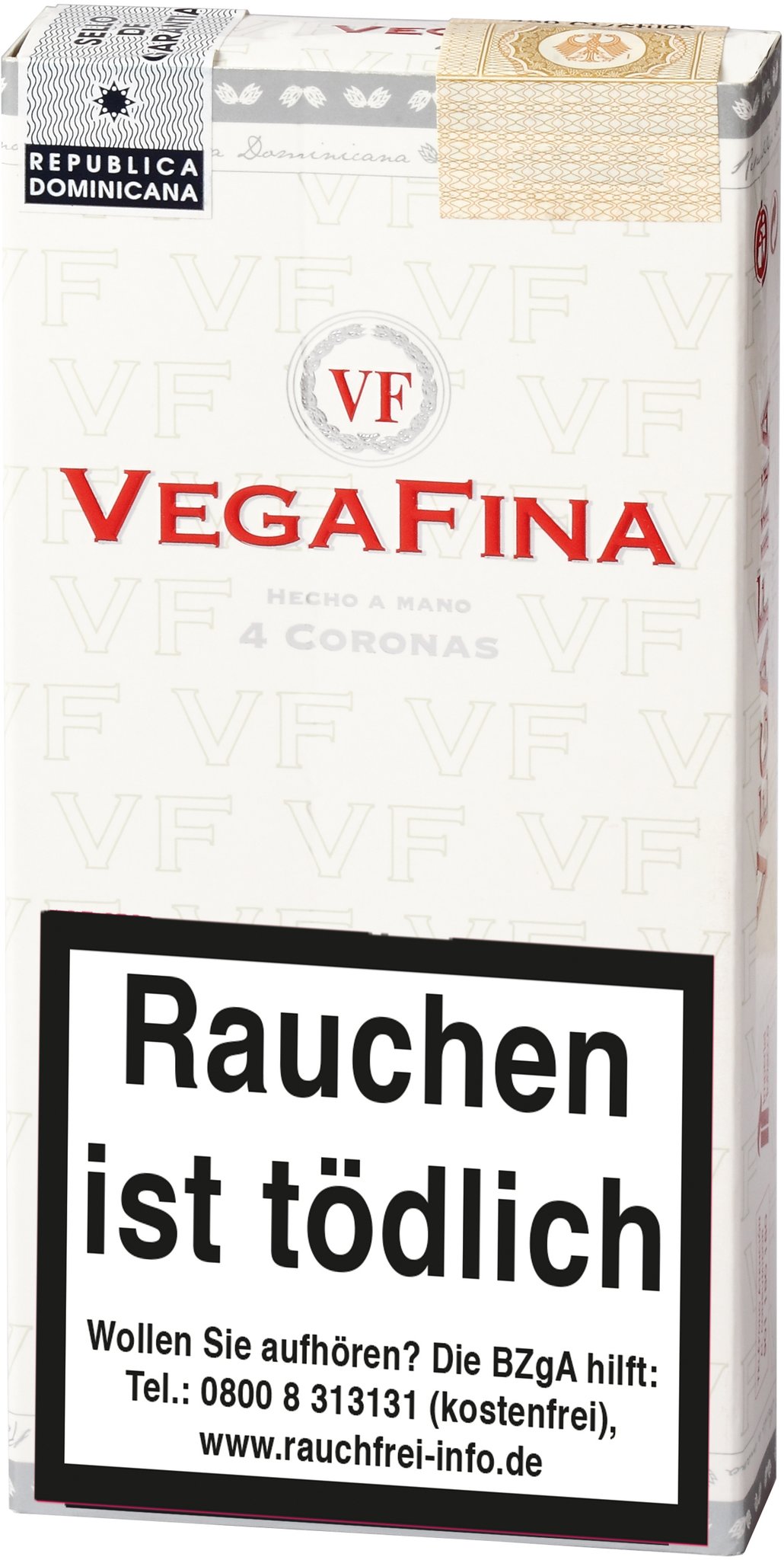Bereits von der Optik beeindruckt die Corona durch das Ecuador-Connecticut-Seed-Deckblatt, welches die Einlage aus verschiedenen dominikanischen Tabaksorten umhüllt. Die Vegafina Corona ist vom Aroma her mild bis mittelkräftig und offenbart im Genuss einen leicht cremigen Geschmack. Aber auch vom Format kann sich die Corona sehen lassen, denn sie misst in der Länge 146 mm und ist 16,67 mm dick. Damit liegt diese Zigarre nicht nur gut in der Hand, sondern verspricht auch ein langes Raucherlebnis, das man vor allem nach einem guten Essen genießen kann. Angeboten wird die Corona im Viererpack und in der Kiste zu 25 Stück.